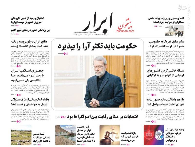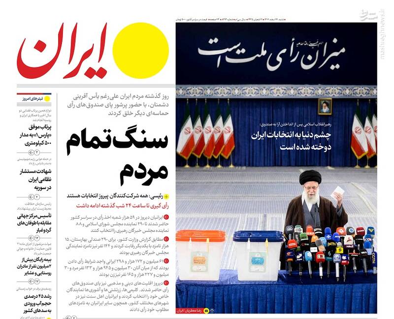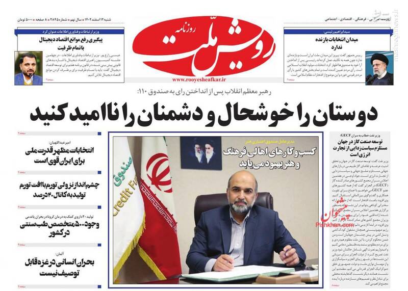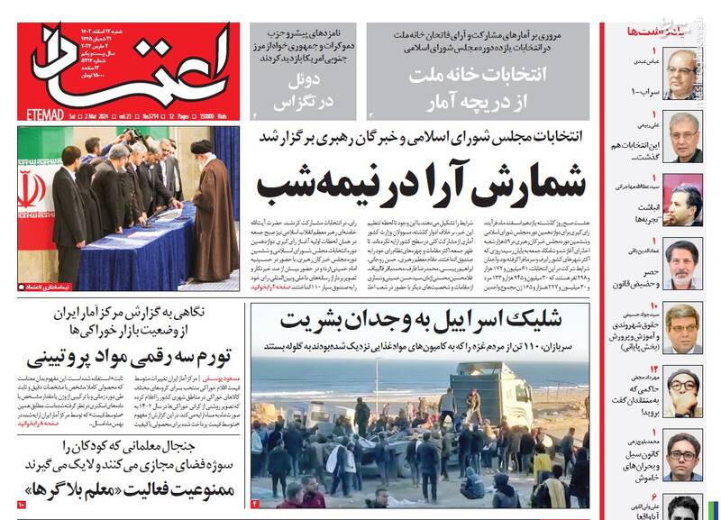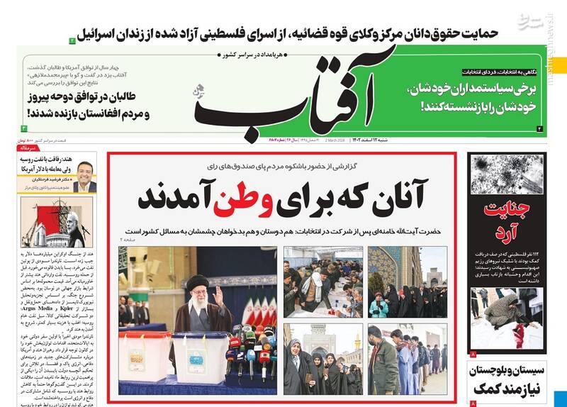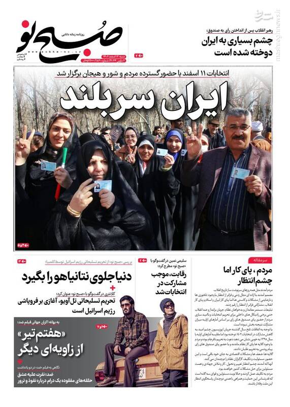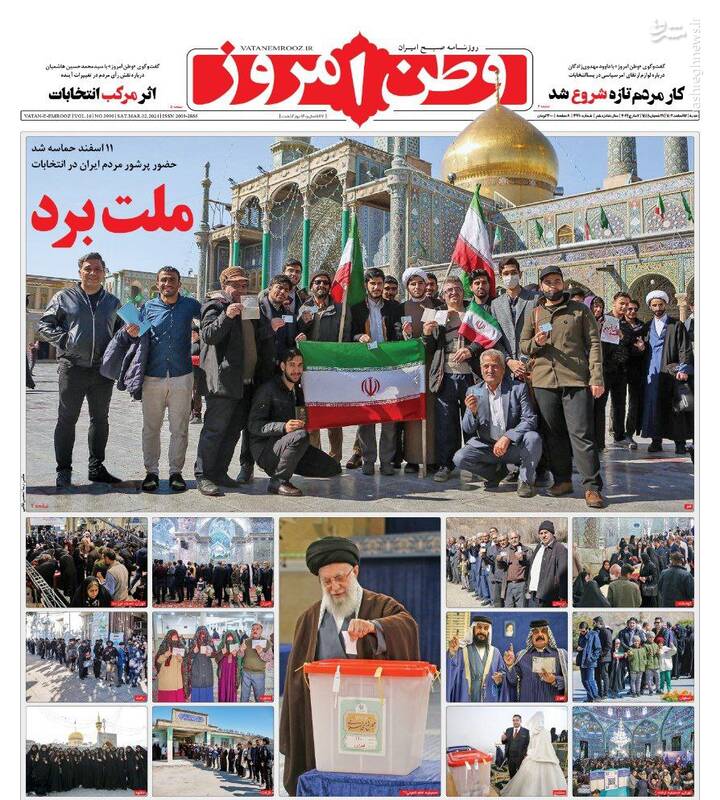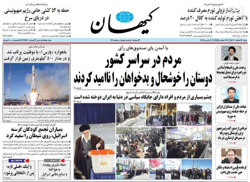 کبنا ؛ملت برنده، مردم در سراسر کشور دوستان را خوشحال و بدخواهان را ناامید کردند، کار خیر ملت، سنگ تمام مردم، تیتر برخی از روزنامههای صبح شنبه ۱۲ اسفند ۱۴۰۲ است.