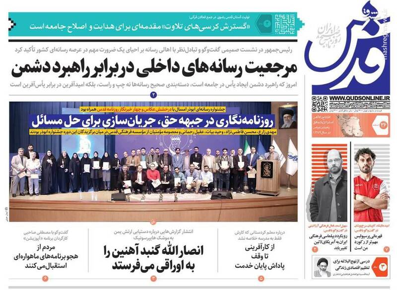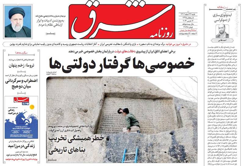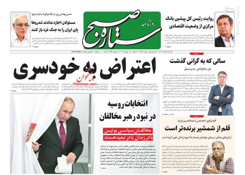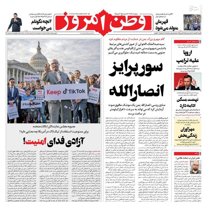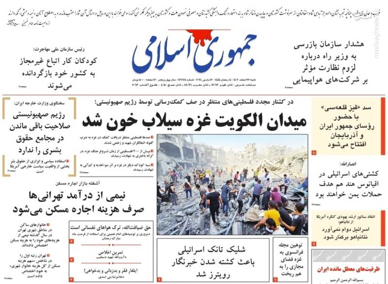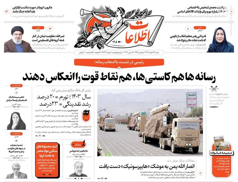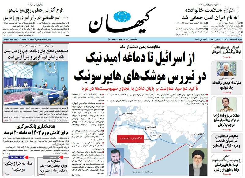 کبنا ؛از اسرائیل تا دماغه امید نیک در تیررس موشکهای هایپرسونیک، اکثریتی شبیه مجلس یازدهم، حفظ مرجعیت رسانهای در گرو روایت منصفانه، برخی از روزنامههای شنبه ۲۶ اسفند ۱۴۰۲ است.